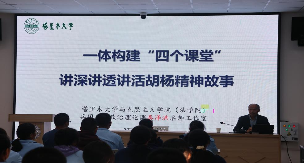 随后,秦泽洪作“一体化构建‘四个课堂’讲深讲透讲活胡杨故事”主题讲座,以胡杨精神为核心,就胡杨精神的内涵、塔里木大学与胡杨精神、如何借助“四个课堂”讲深讲透讲活胡杨故事进行具体讲述,深入挖掘了塔里木大学的“三个不平凡”,取得热烈反响。与会师生通过聆听讲座,进一步加深了对胡杨精神的理解,增强了文化认同,为铸牢中华民族共同体意识注入强大动能。